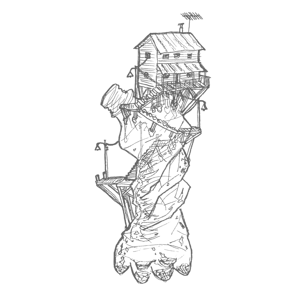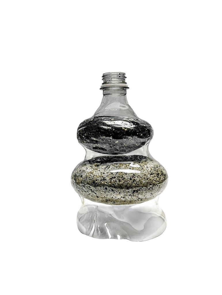 Steel base frame for stability, wrapped in stones for weight, and sealed together with plastic. Angles are adjustable via a plastic welded strip under constant tension, weighted by the opposite side of the hinge. The form of the gallon jug is accentuated, not hidden, it’s identity on full display. The handle is the logical connection point, and the mouth of the jug serendipitously mates with the light fixture.