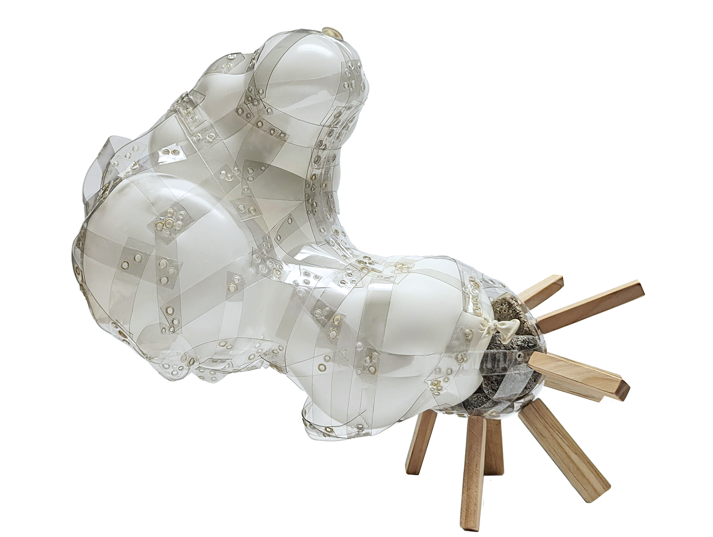 As with all three final pieces, dozens of experiments came together for a powerful whole. A huge variety of forms can be created using the spot-welding technique. In contrast with the more utilitarian spot welding of the lamp, this piece uses widely differing shapes of plastic. The wood-to-plastic connection and suspension of stones further illustrates the potential interfacing with other materials. Stones do not require any fastener, held instead by the pressure of inflated balloons, which lend visual weight. The legs are attached with screws, through holes formed by the spot welds, with the shape of the plastic being stabilized by stone and pressure. Stones are suspended in the core, with the plastic weight being negligible. Due to the weight ratio and radial leg pattern, it is highly repositionable, even as a cantilever.
