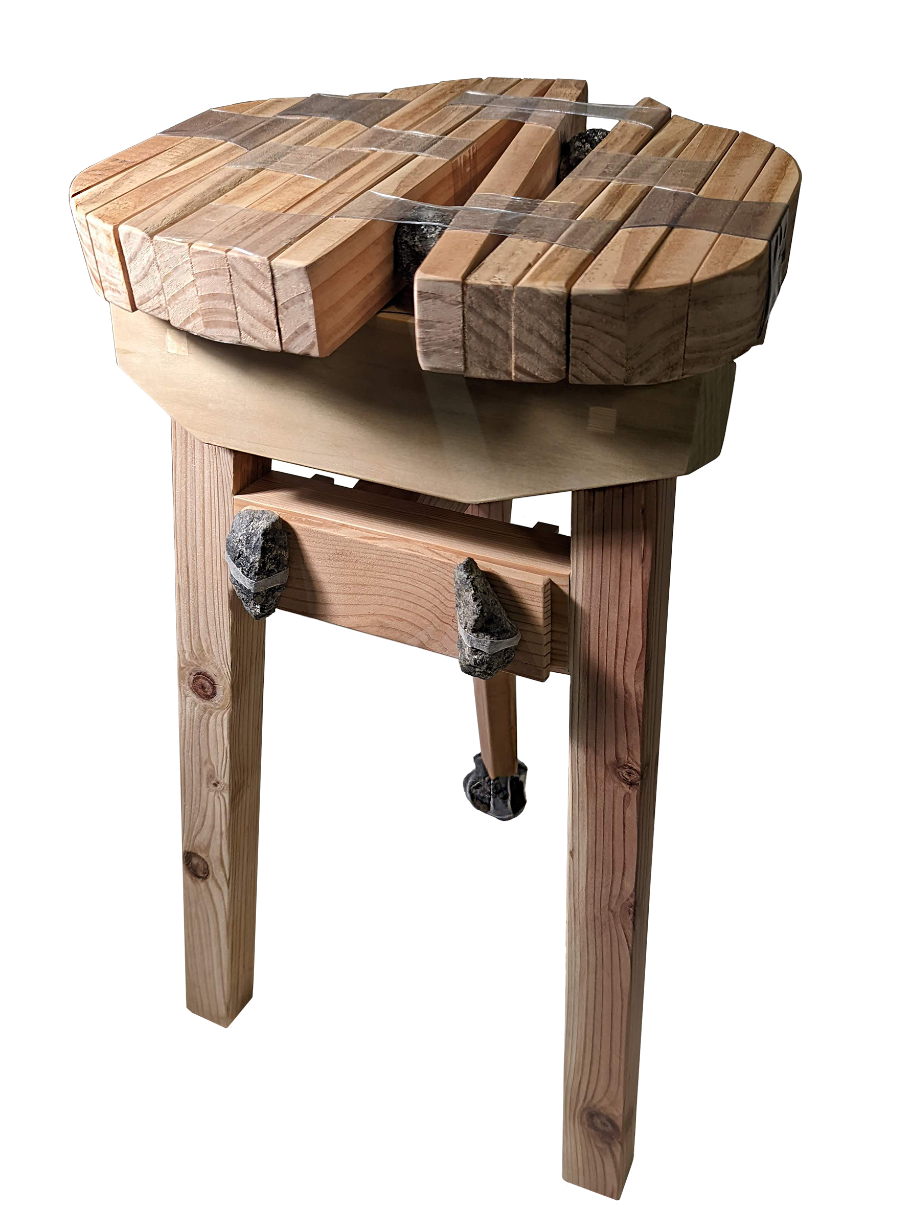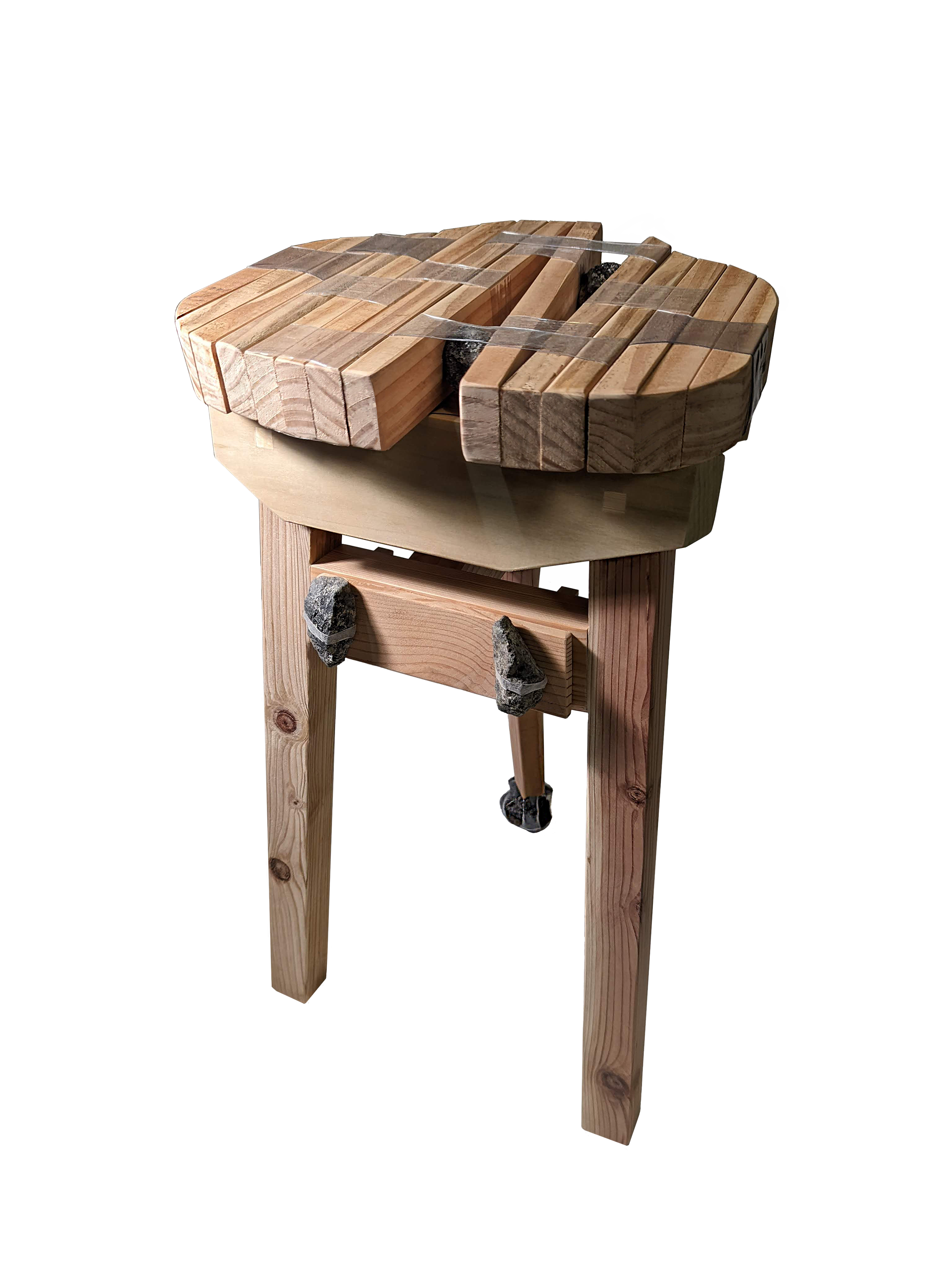 The stool showcases multiple forms of the same base technique. It is an iteration of a design using sections of wood joined by plastic, in conjunction with traditional carpentry joints. For the stone foot, plastic rings are used to stabilizing the stack, crossed over one another, attached to the wood leg, and shrunk into place around the stones, applying tension. The stone to wood connection has incredible compression strength.